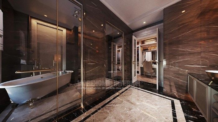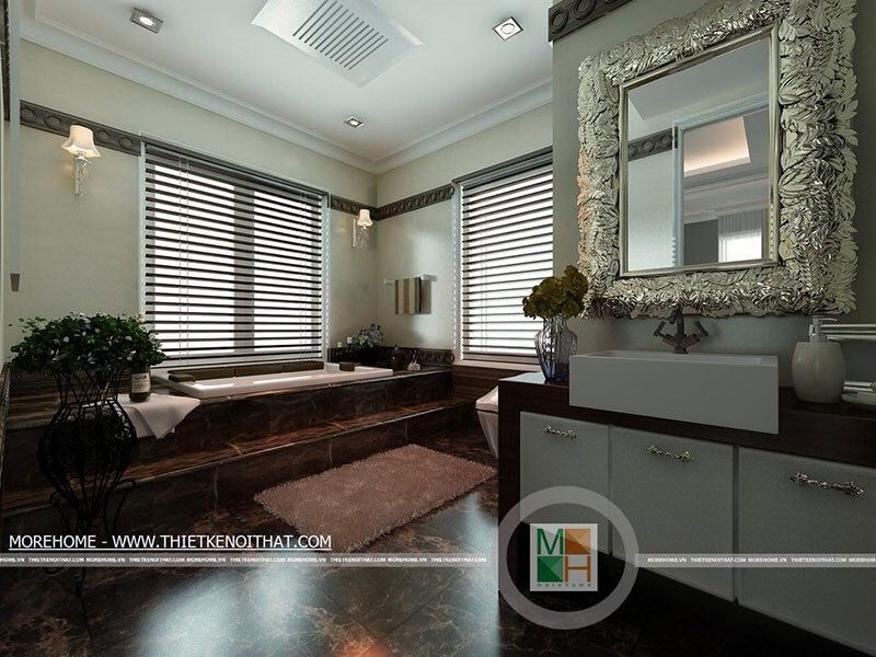 Phòng tắm sang trọng cho biệt thự của bạn sẽ được trang trí bằng những kệ tủ và thiết bị đồng màu trắng tinh tế, tạo nên một cảnh quan đẹp mắt và cuốn hút mọi ánh nhìn.